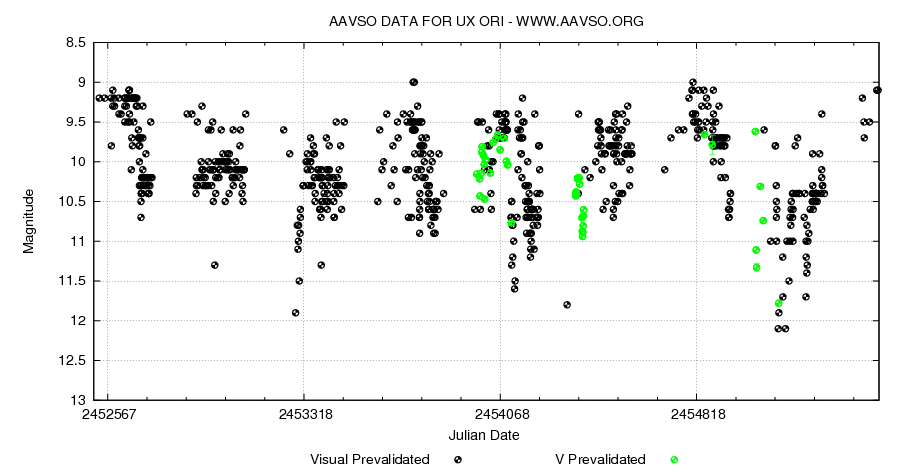 Named after the prototype of the class, UX Ori type variables (commonly called UXOrs) are intermediate mass, pre-main sequence Herbig Ae/Be stars. The light curves of these stars show Algol-like fadings of 1 magnitude or more in random intervals of days to weeks. These fadings are accompanied by a change in color and are thought to be caused by non-uniform dust structure around the star.